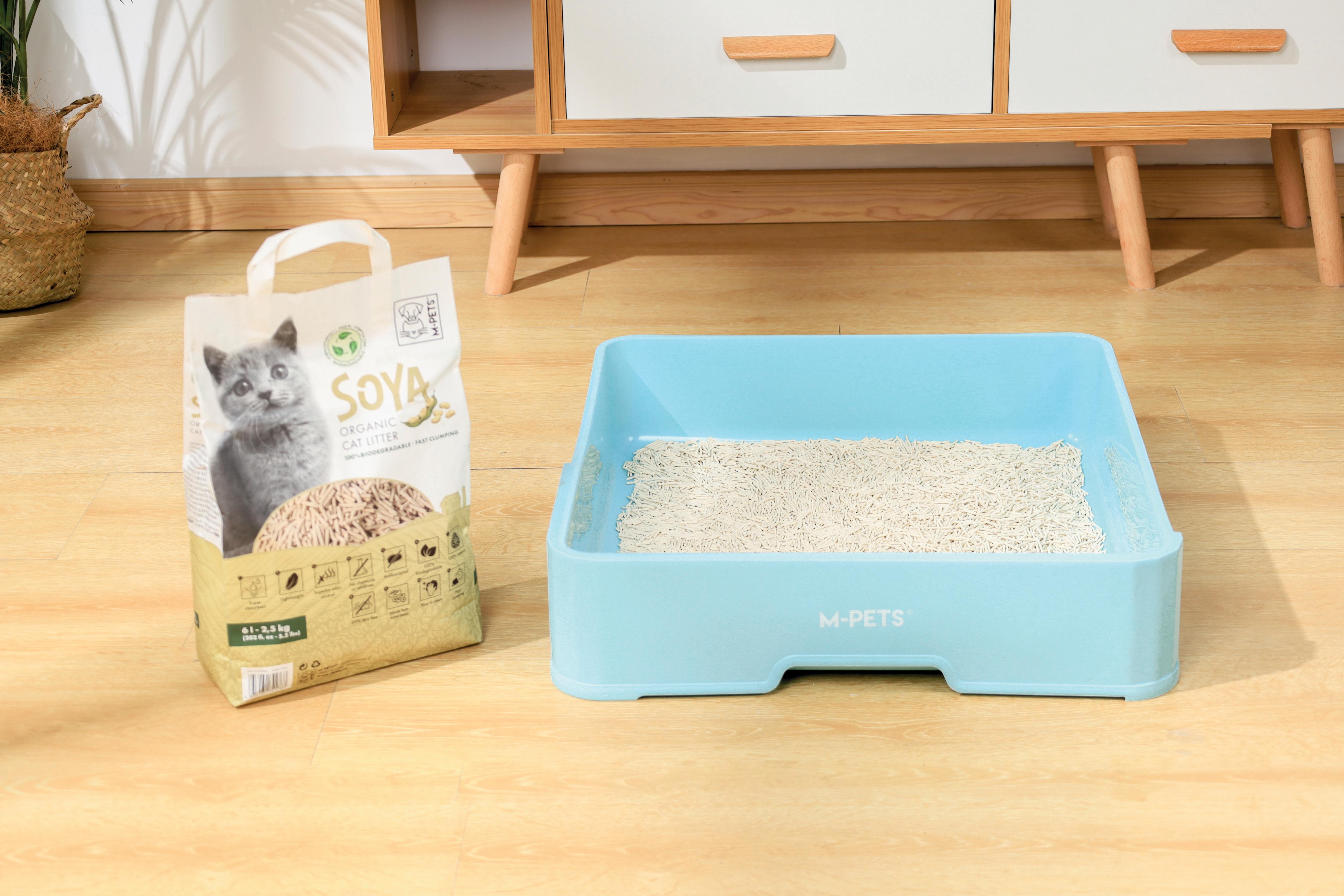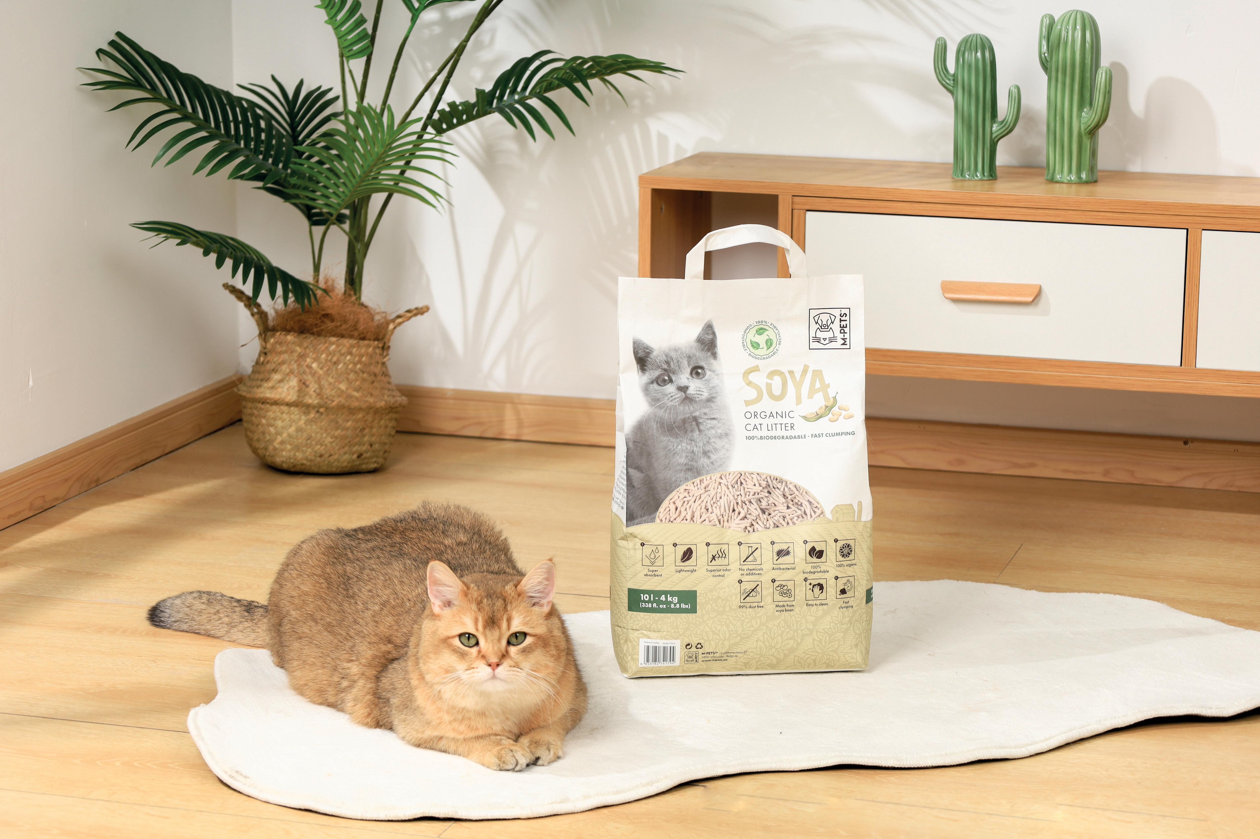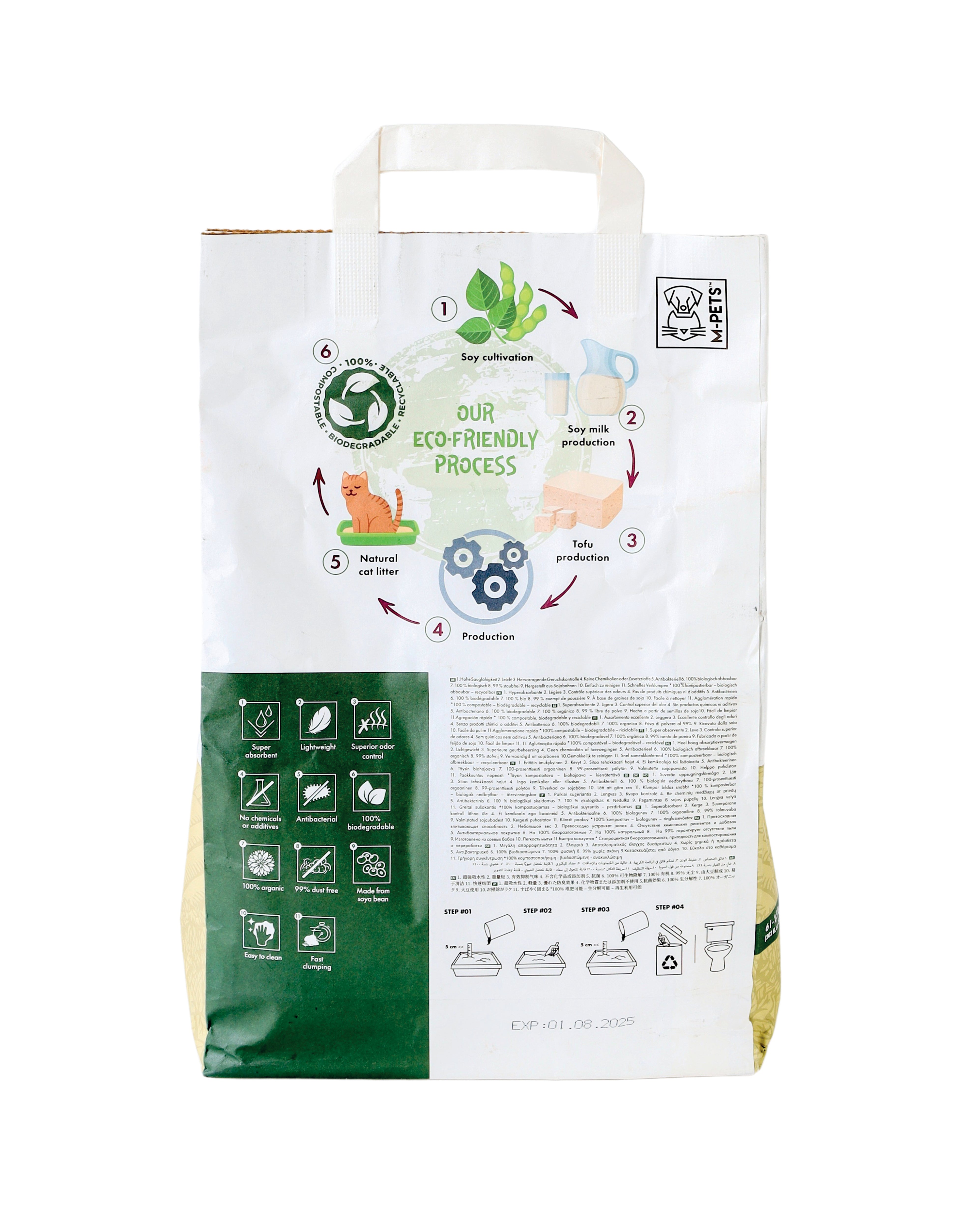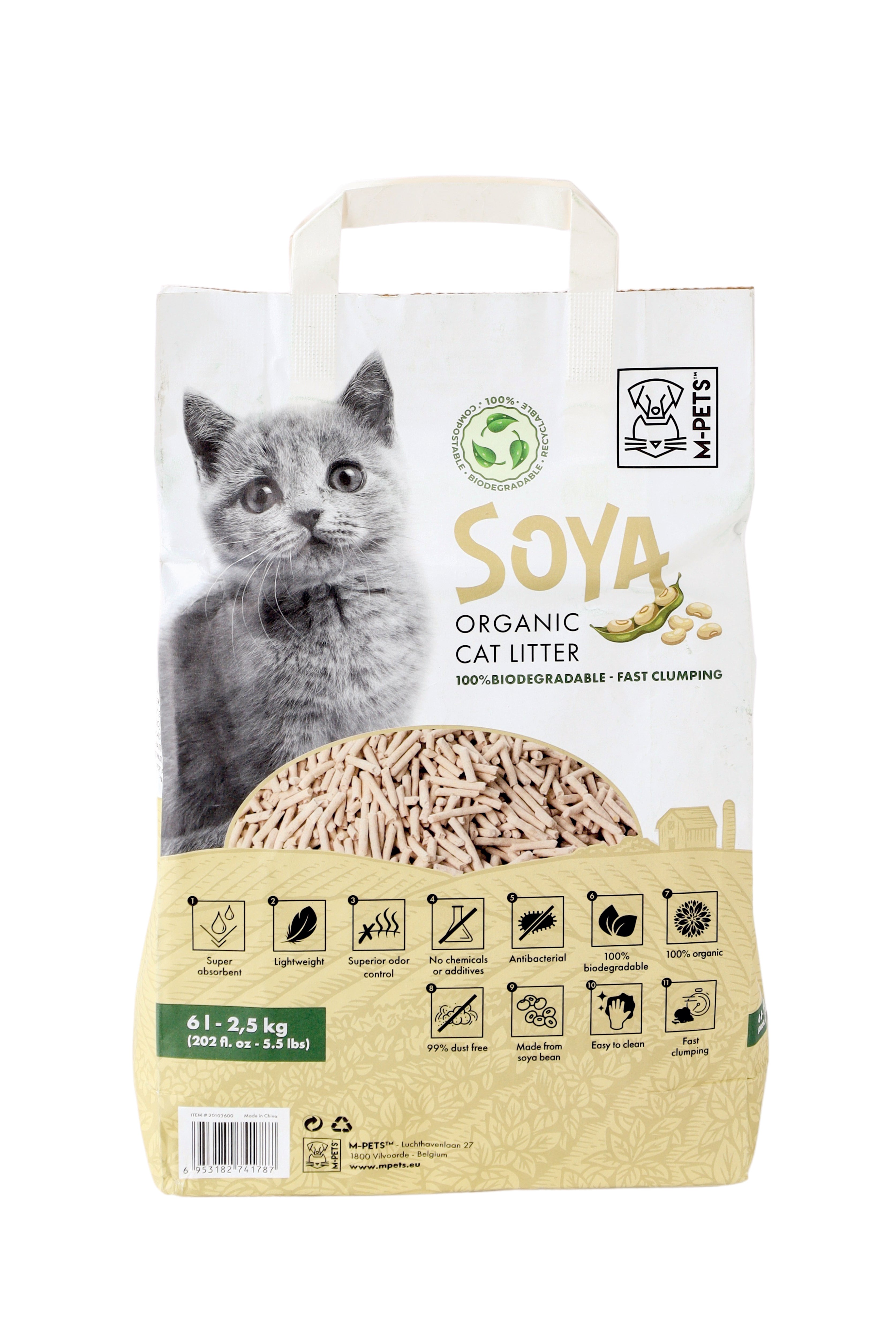 La lettiera per gatti SOYA Organic è 100% biodegradabile. Questo prodotto unico è realizzato con le parti insolubili della soia, che si trovano nella produzione del latte di soia. Questa lettiera per gatti funziona come un eccellente assorbente di liquidi, in quanto può assorbire l'umidità fino a 3 volte di più rispetto alle lettiere tradizionali in argilla o cristallo. Con una formula a rapida agglomerazione, si raggruma al contatto con i liquidi.