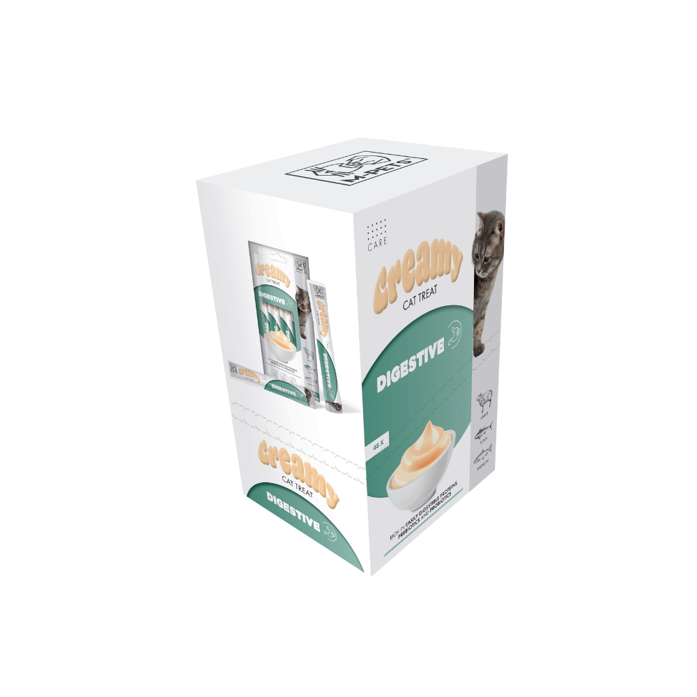 Per pance felici e una digestione sana! La nostra formula Creamy Cat Treat Digestive presenta una miscela nutriente di agnello, tonno e salmone per supportare la salute digestiva del tuo gatto. Ricca di proteine facilmente digeribili, prebiotici e probiotici, questa delizia cremosa è perfetta per mantenere un intestino sano. Un trattamento nutriente per il tuo gatto, con un alto contenuto di umidità per favorire l’idratazione e la digestione.